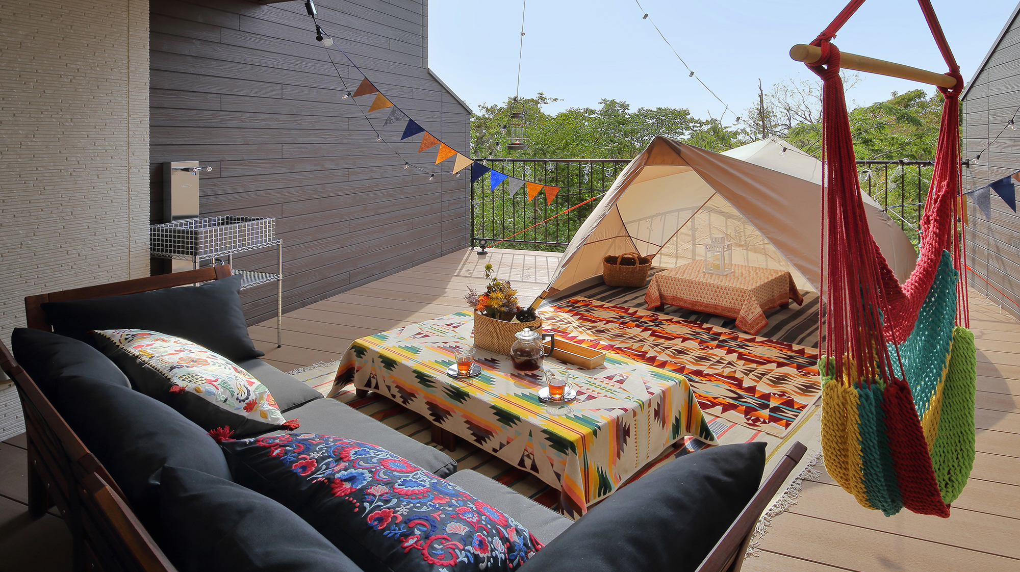 お部屋のバルコニーがプライベートグランピングサイトになっており、お部屋からそのままいけるので、こどもたちが外でキャンプを楽しんでいる間にパパママは中でゆったりできます✨