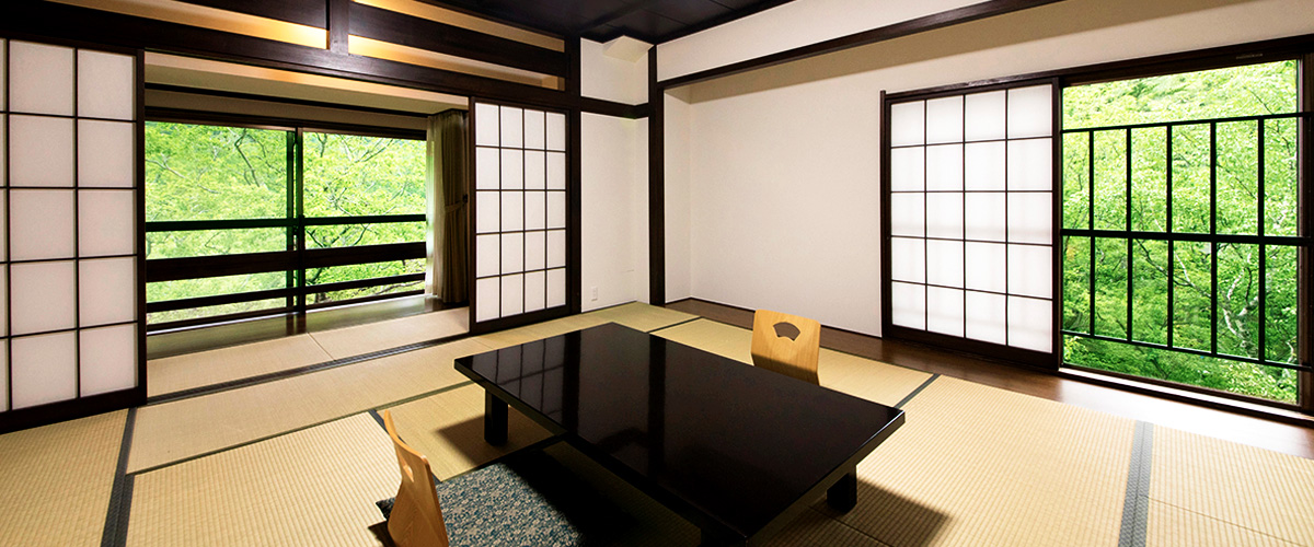 本館は畳の落ち着いた和室で、穂高側と梓川側でお部屋の景色が変わり、どちらの景色も落ち着いて過ごすことができます。