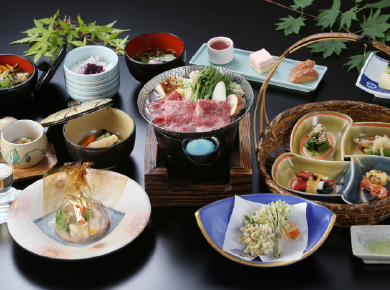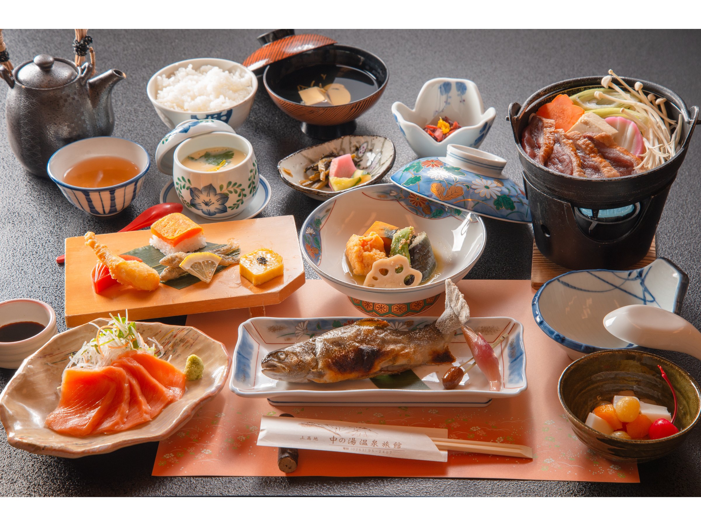 夕食には板長手作りの山菜料理やあったかいお鍋が並び、お子さまも一緒に楽しめるやさしい味わい。