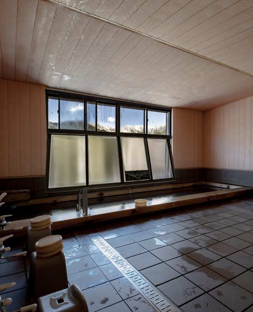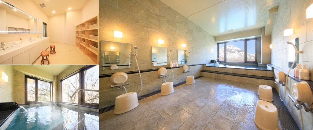 大浴場にはきれいな伏流水を使用。大きな窓から穂高連峰を眺めながら、特別な入浴体験ができます♨️