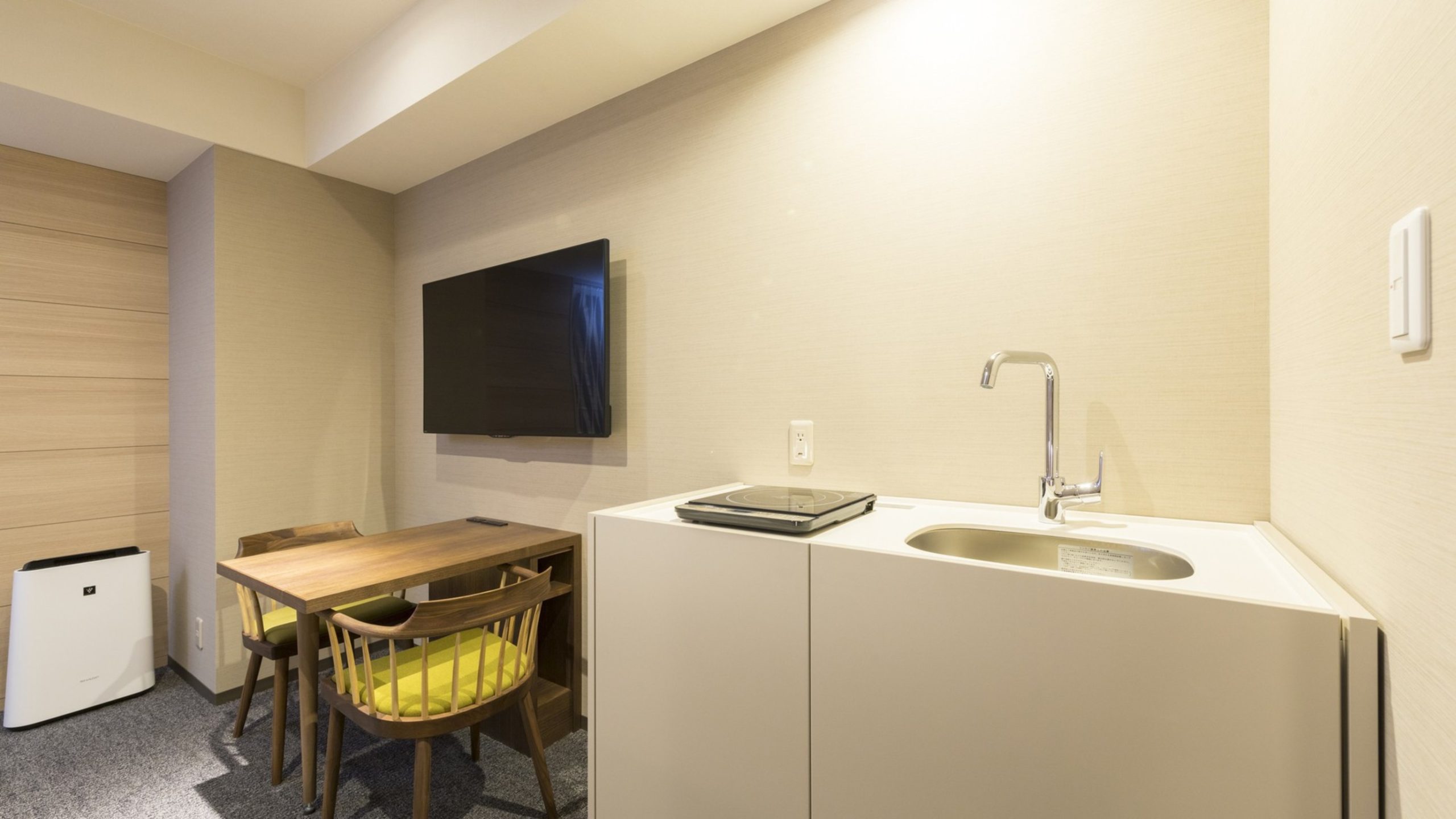 「デラックスツイン」にはミニキッチン付きです。スタンダードの客室はバス・トイレはユニット型ですが、明るく清潔感のある空間。シンプルながら快適な滞在が叶います。