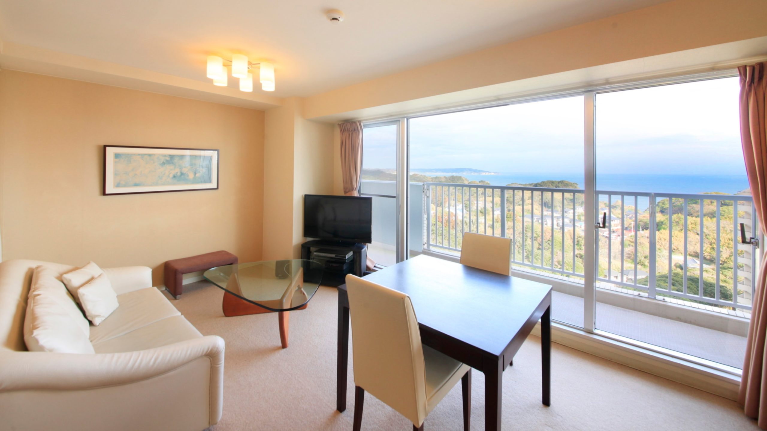 勝浦の高台に建つ14階建てのリゾートマンションの9~13階にある「勝浦ヒルトップホテル&レジデンス」。全室オーシャンビューのコンドミニアムタイプで、キッチン・電子レンジ・洗濯機など生活設備が充実しており、長期滞在や家族旅行にもぴったりです。かけ流し温泉やサウナ、レストランも併設。ベッド2台のツインルームから、広々2LDKのコンフォートフォースまで、暮らすように快適な滞在を楽しめます。