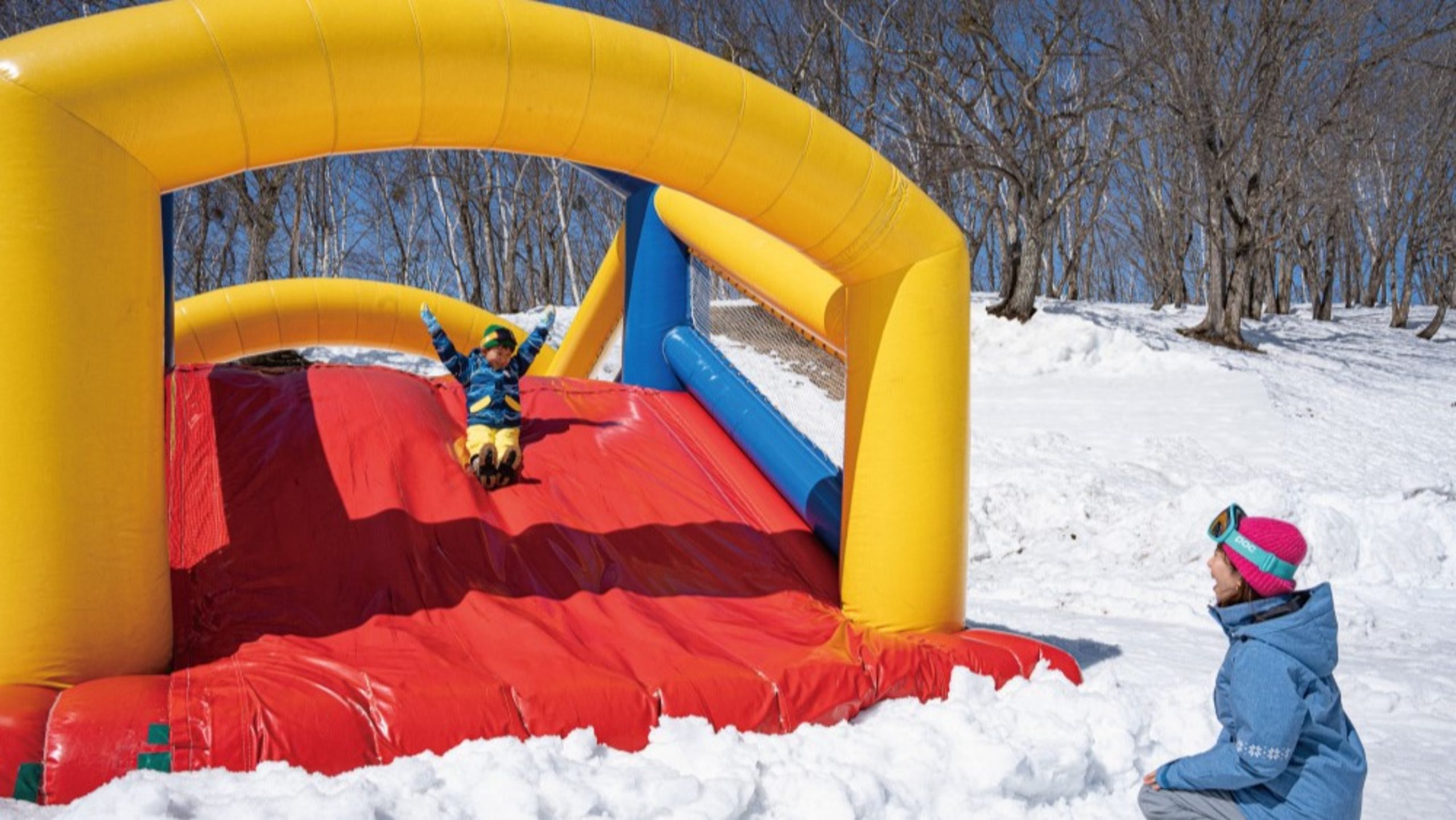 県内最大級の広さを誇るキッズパークはふわふわ遊具やソリ遊びが楽しめ、「バンビパーク」ではムービングベルトで初心者もスキー・スノボ練習ができます。