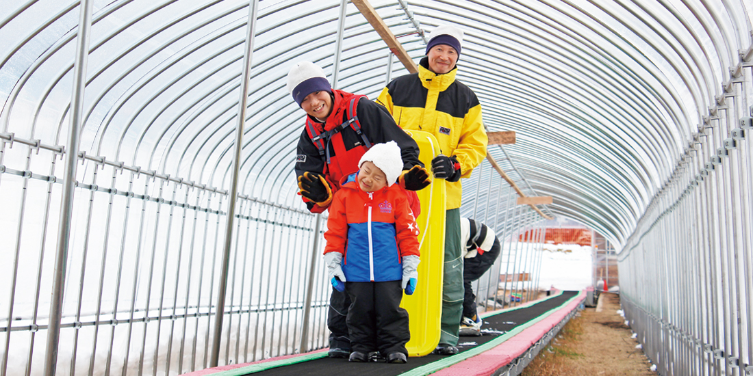 「わくわくファミリースノーランド」は、ふあふあ、カルーセル、スノーチュービング、そり遊びなどが楽しめるちびっこ広場。スノーエスカレーター付きで移動もラクラク。スノートレイン(有料)は家族で乗れる人気アトラクション。「カッパスノーモービルランド」では雪上バイク体験もできます。