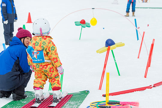 ホテル前のスノーエスカレーター沿いに設置される専用地形を使い、初心者〜初級者向けのスキー・スノボレッスンを実施。小学生以上から参加できるグループレッスンと、4歳から受けられる個人レッスンが選べ、子どものレベルに合わせて丁寧に指導してくれます。
