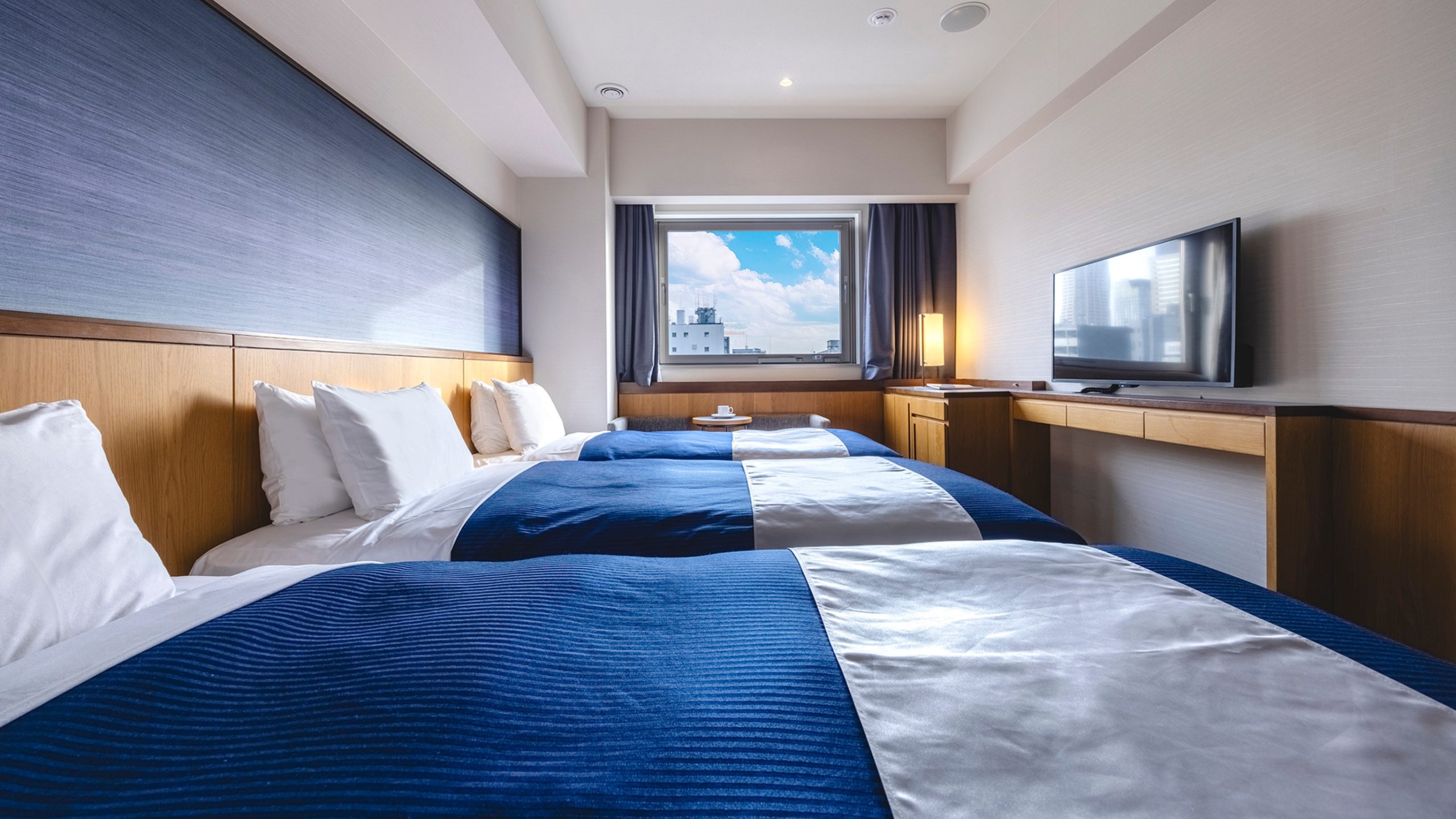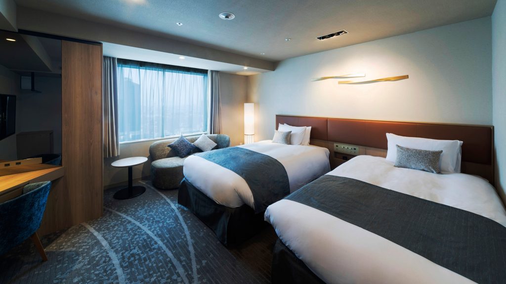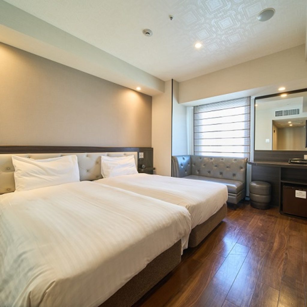 大阪駅から徒歩5分の好立地にある、小学生添い寝無料のビジネスホテル。デラックスツインは23平米のフローリング客室で、シングルベッド2台を並べたハリウッドツイン仕様。デスクやソファも備え、バス・トイレ別の広めの浴室で快適に過ごせます。