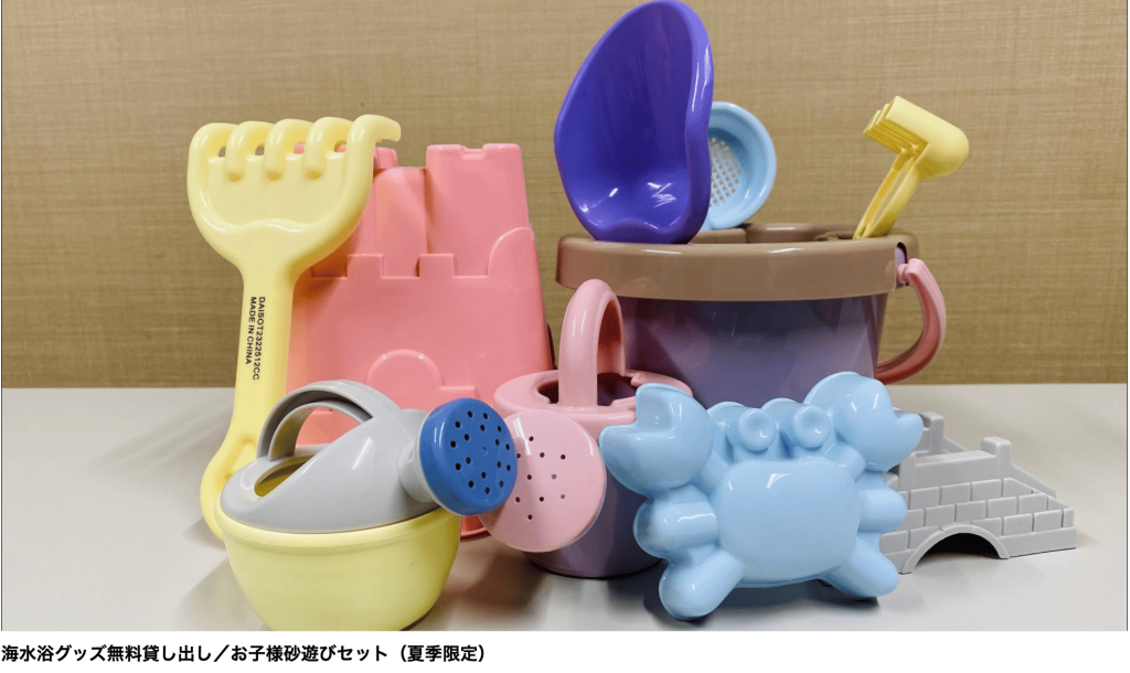貸出ベビー用品には、ベビーベッド、ベビーガード、補助便座、踏み台などがあり、赤ちゃんの安全と快適さをしっかりサポート。夏場は砂遊びセットなども借りられます🤗