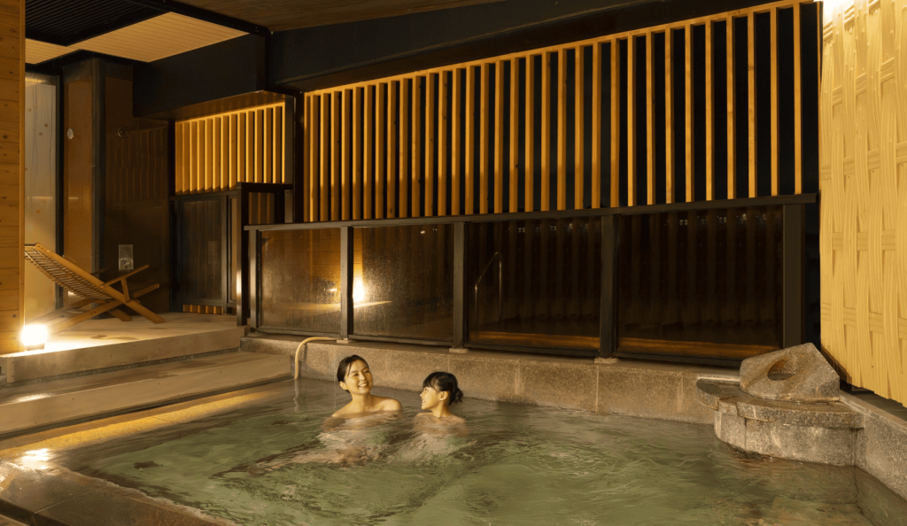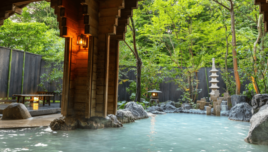 露天風呂は岩を配した自然を感じる造りで、屋根付きスペースもあり天候を気にせず利用可能。昼は森に囲まれた静かな雰囲気、夜はライトアップされた庭園を眺めながら、時間帯によって異なる景色を楽しめます。男性露天にはテラススペースも併設され、外気浴も可能です。
