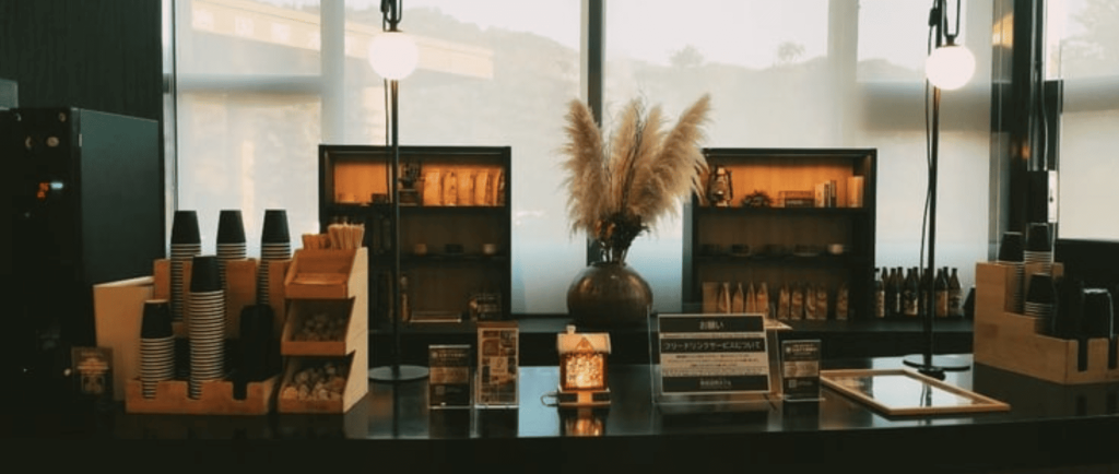 館内ラウンジは清潔感があり、コーヒーや焼酎のサービス、イベントの開催なども楽しめます。