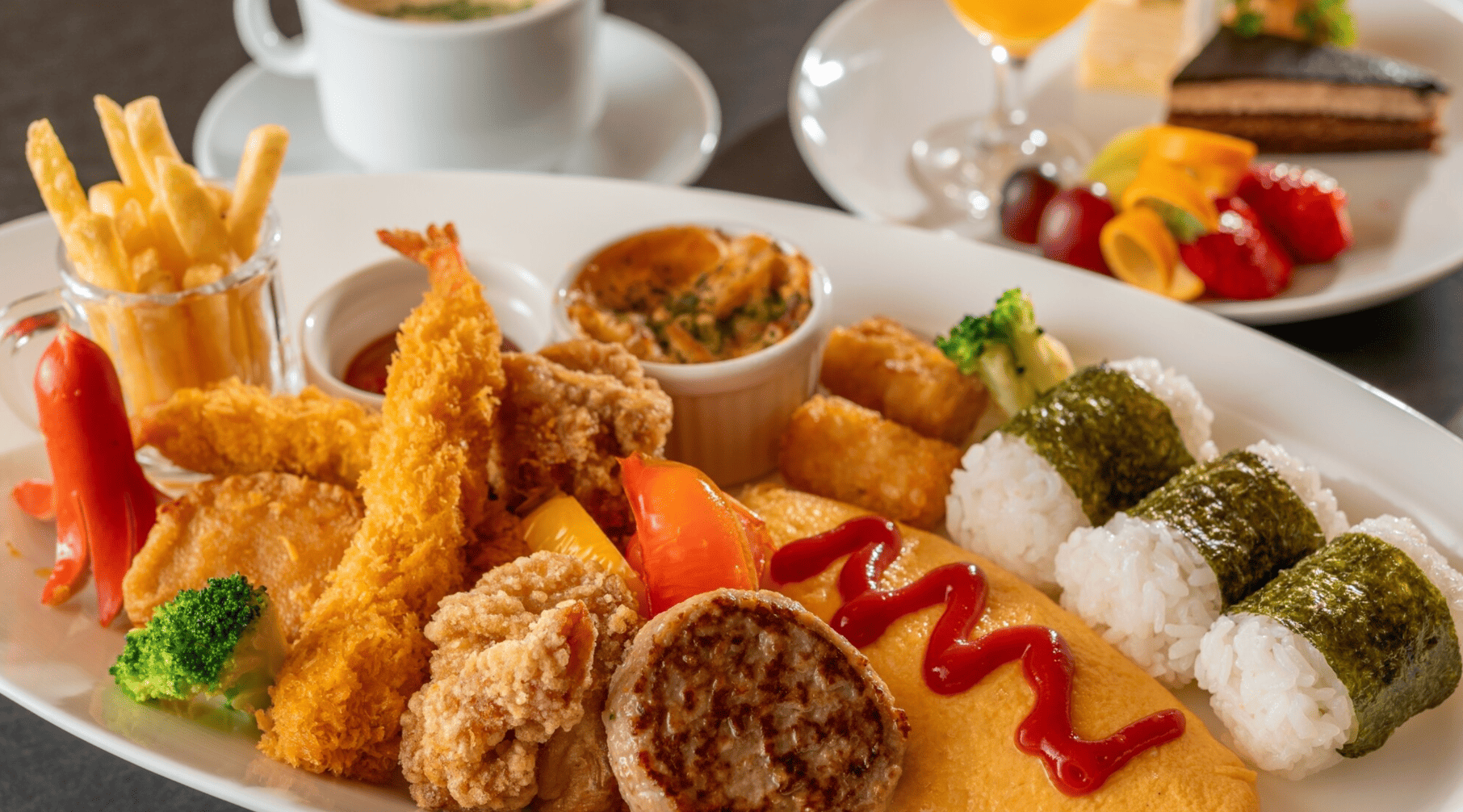 ライブキッチンでは揚げたて天ぷらやステーキが提供され、家族全員が満足できる食事時間を楽しめます。