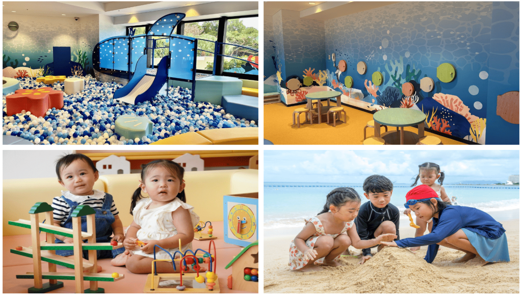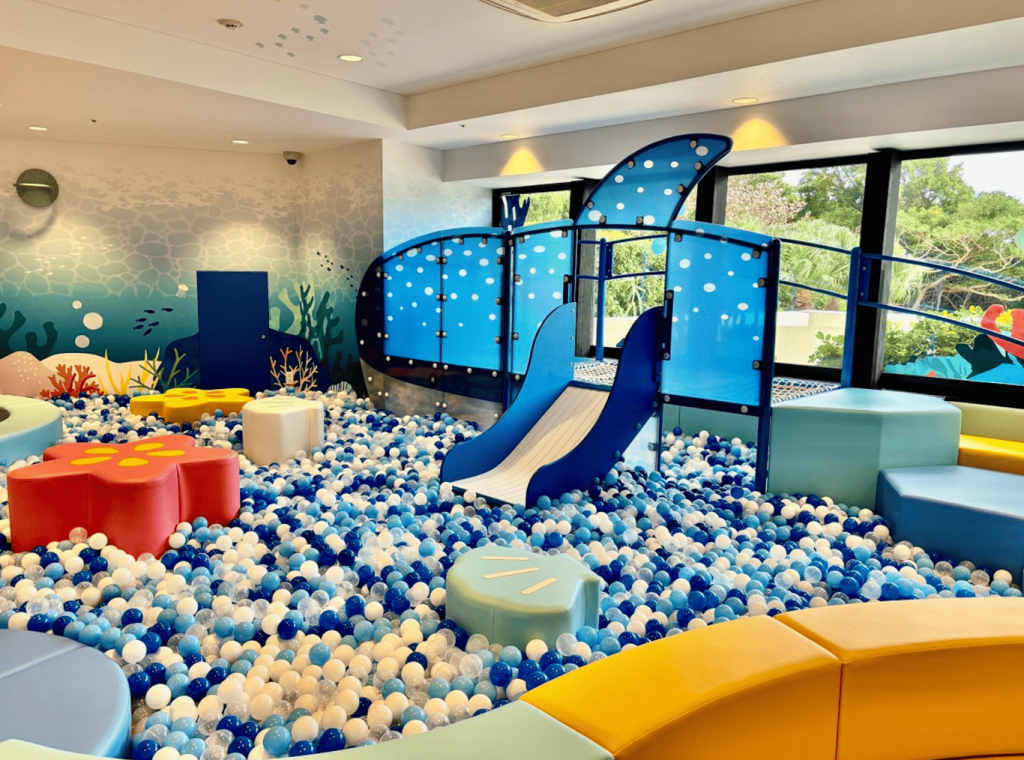 ホテルモントレ沖縄は、美しいタイガービーチが目の前に広がる人気リゾートホテル。2024年に屋内キッズルームがリニューアルされ、沖縄の海の世界をモチーフにした空間に生まれ変わりました。