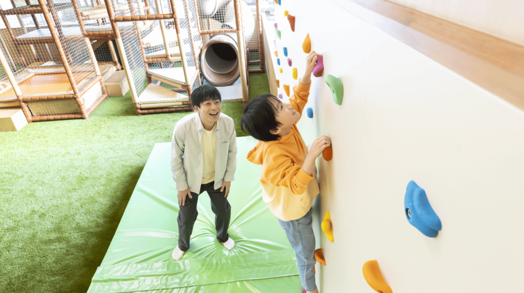 館内には、年齢を問わず家族みんなで楽しめる遊び・くつろぎスペースが充実しています。人工芝が敷かれた屋内キッズパークには、木製の大型遊具やネット遊具、ボルダリングウォールが設置されており、体をしっかり動かして遊べるのが特徴。周囲には腰掛けスペースがあり、大人が近くで見守れる設計です。