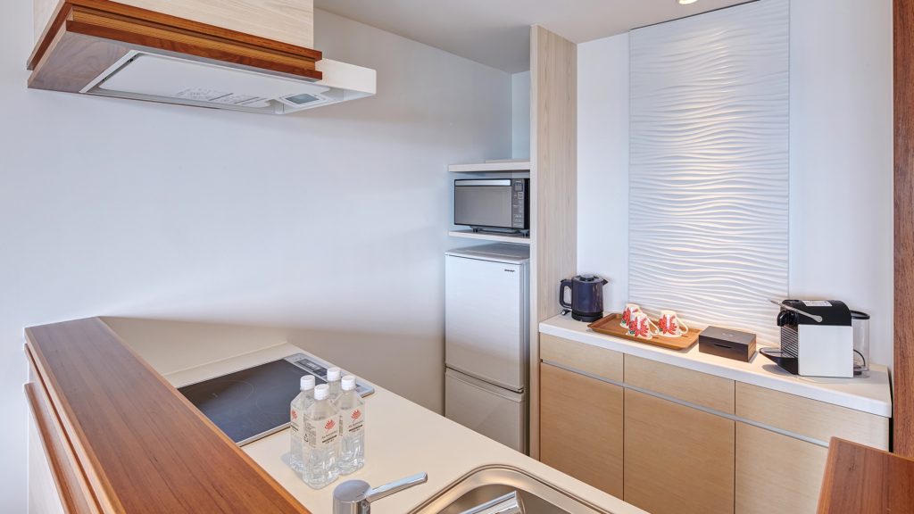 客室には、キッチンや調理器具・食器類、大きめの冷蔵庫や電子レンジも供えられており、暮らすような滞在が可能。連泊にもおすすめです。