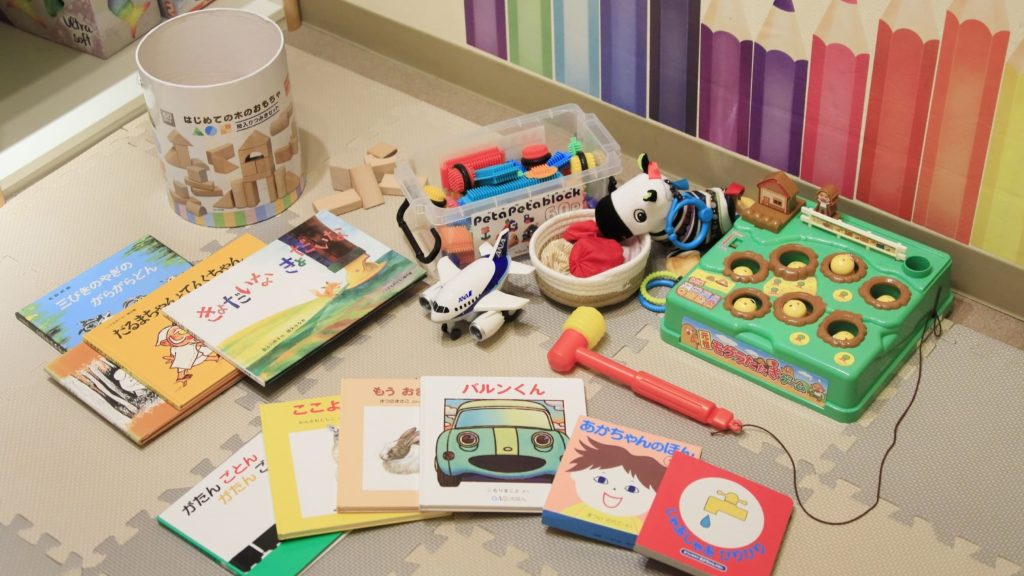 おむつや離乳食、おもちゃや絵本もお部屋に用意されています。必要なものがすべて揃っているから、たくさん荷物を用意しなくていいのが楽🤗