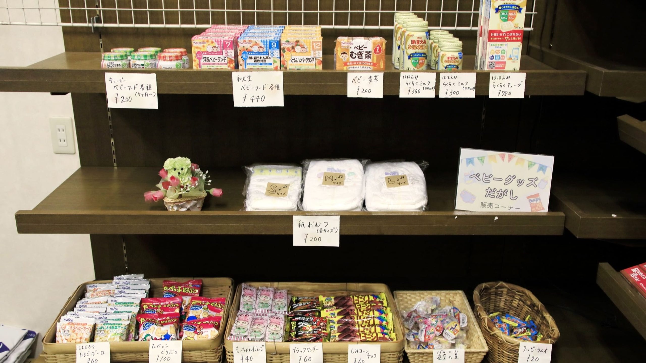 また、館内の売店には、おむつや離乳食、昔懐かしい駄菓子まで揃っています。急な買い物が必要になったときにも安心ですね!