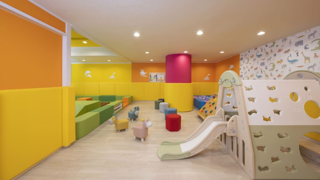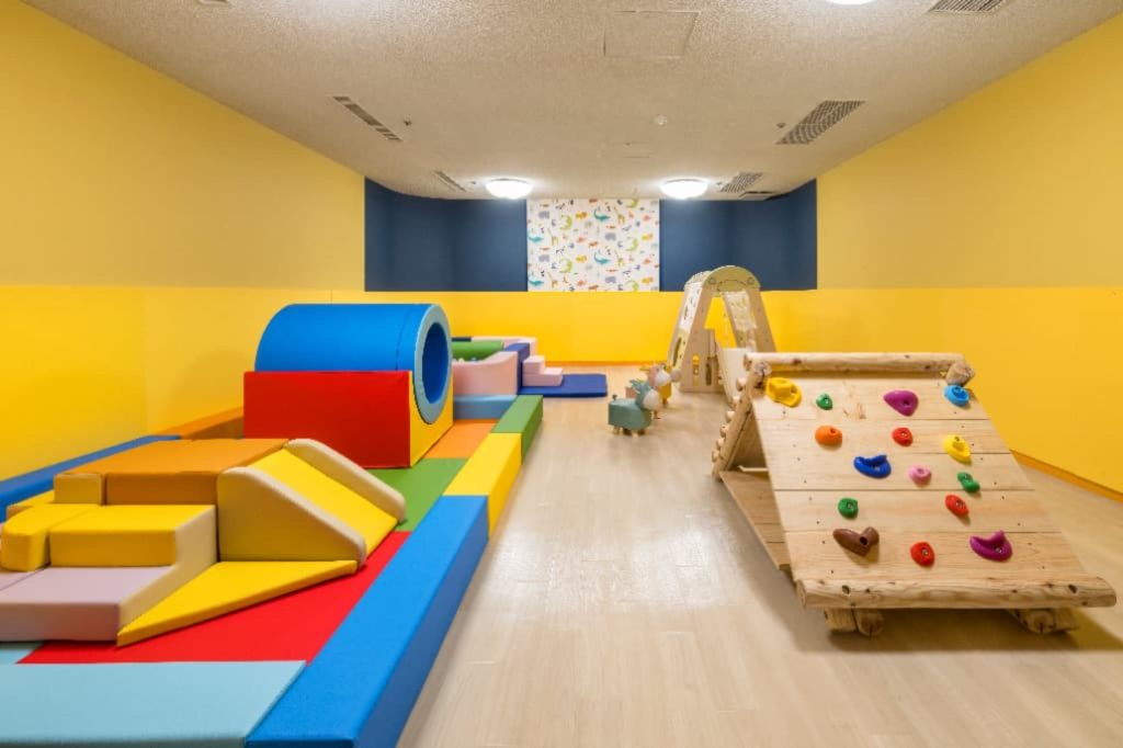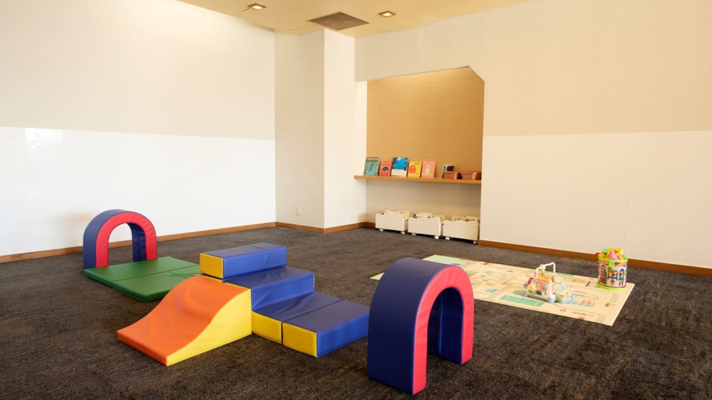 ホテル内のキッズスペースはクッションマットを敷いた遊び場になっています。遊具や絵本とともにのびのびと過ごすことができますよ!