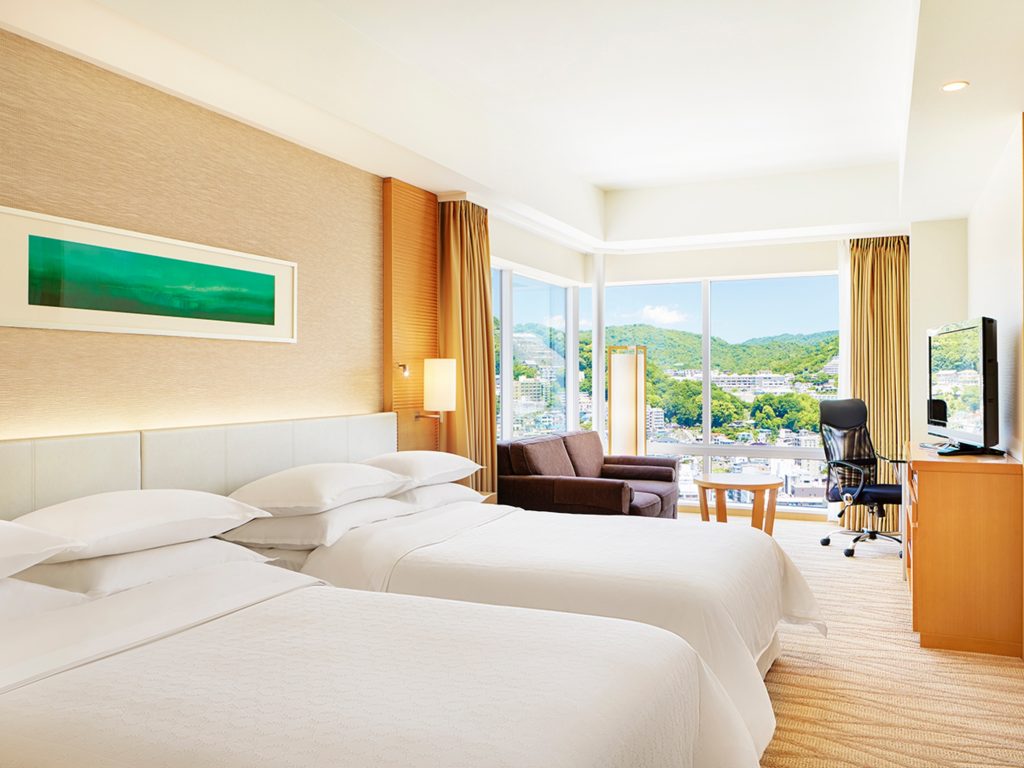 JR広島駅に直結のホテルで、雨に濡れずアクセス可能✨広島空港からもリムジンバスで約45分と便利な立地です。全238室の客室やスイートにはシェラトンこだわりのベッドを完備。小学生の添い寝無料です。ビュッフェレストランやクラブフロア宿泊者向けのラウンジ、フィットネスや室内プール・ジャグジー(有料)もあり、快適に滞在できます✨