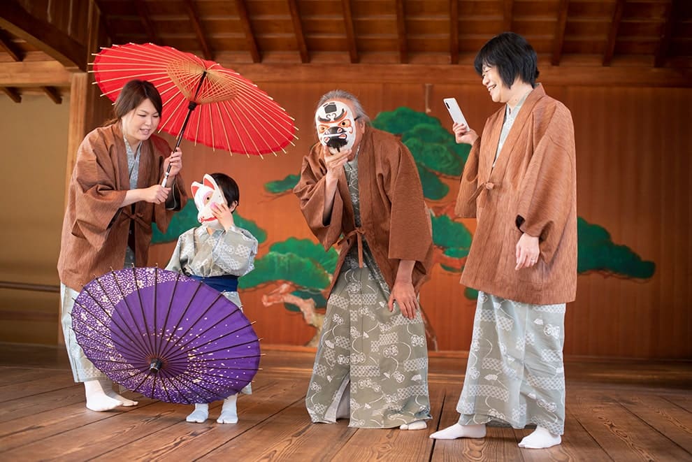 館内にある総檜造りの能舞台「千寿殿」は、自由に写真撮影ができる人気スポット📸 能面や和傘などのアイテムを使って、本格的な雰囲気の中で記念撮影が楽しめます。