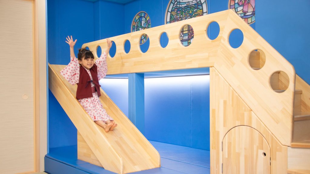 特に2024年にオープンしたばかりの露天風呂付き客室「はな」は、子どもに大人気のお部屋です。すべり台付きロフトがあり、いつでも遊び放題。
