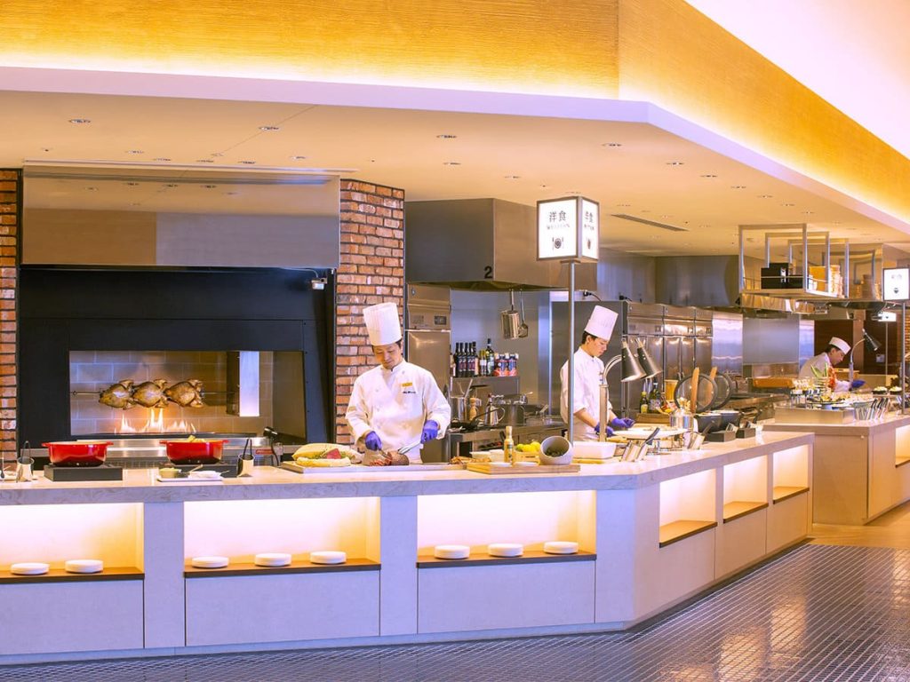「TERRACE & DINING SORA」は和洋中バランスよく食べることでき、ステーキやローストビーフ、ピザ、パスタなど子どもが大好きなメニューが充実しています。オープンキッチンで目の前で焼き上げるシェフのパフォーマンスに子どもたちも釘付け🍕