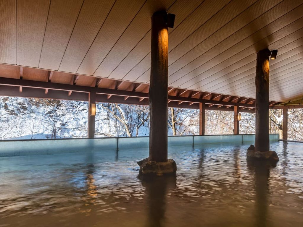 地下にある広々とした大浴場「湯酔郷」の露天風呂から見る雪景色は冬ならではの絶景!ゆっくりと温泉に浸かりながら日々の疲れを癒します💕